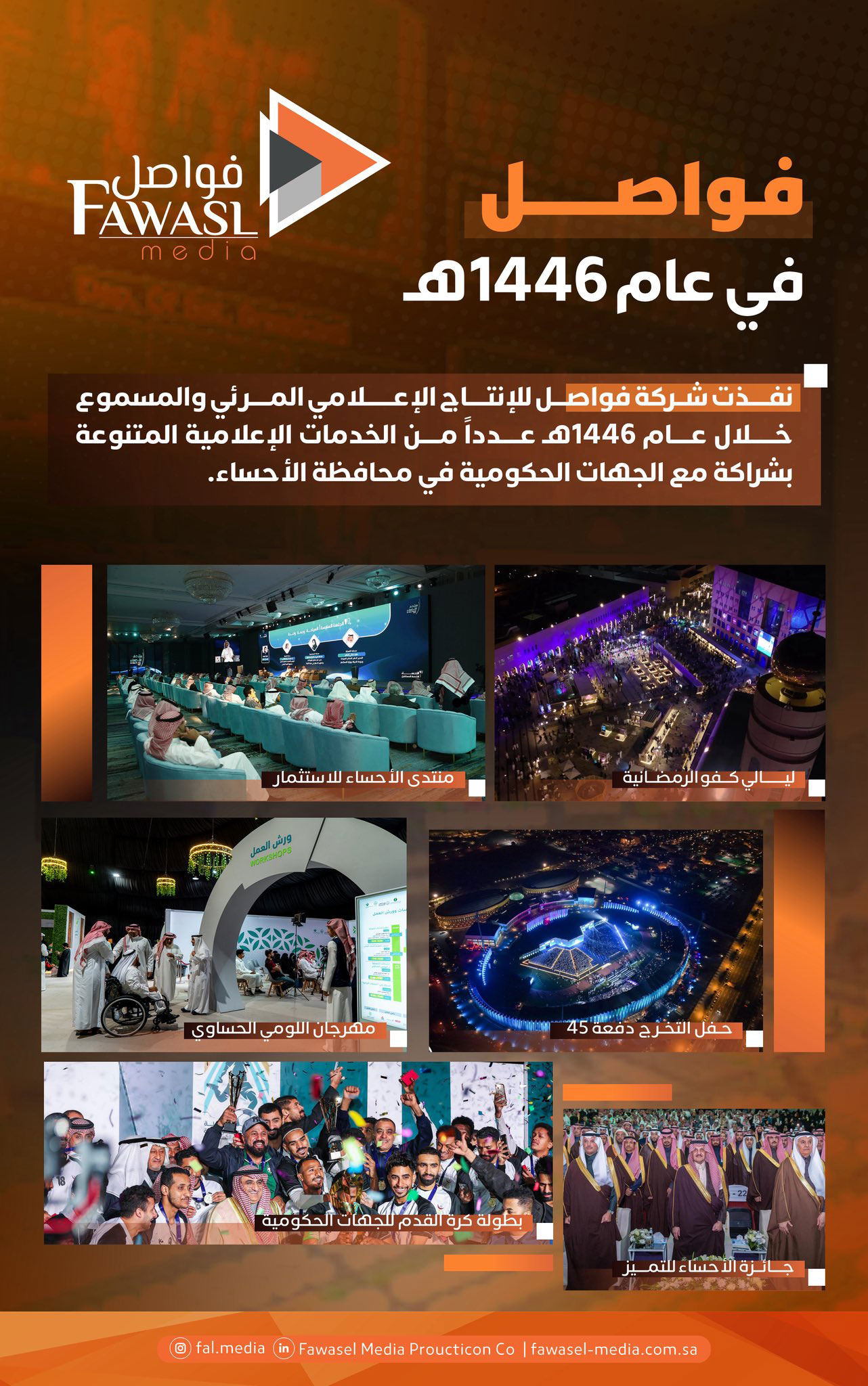 لم تكن مجرد أيام عابرة.. بل كانت لحظات تحولت لذكريات جميلة، وأمسيات صورناها بعدساتنا وأنتجناها باحترافيتنا وإبداعات كوادرنا🎬🤍. من #منتدى_الأحساء_للاستثمار لـ #ليالي_كفو__الرمضانية، ومن حفل #تخرج_جامعة_الملك_فيصل إلى #بطولة_الجهات_الحكومية بالأحساء. شكرًا لثقتكم بنا✔️